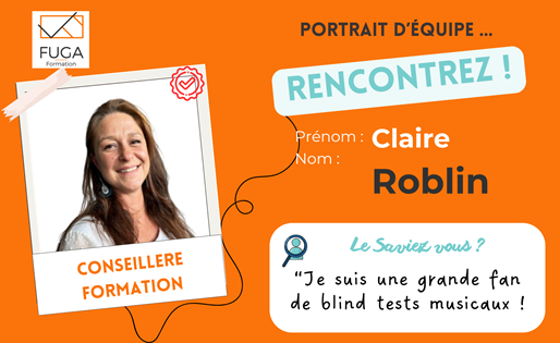 Chez FUGA FORMATION, chaque membre de l’équipe a son histoire… et aujourd’hui, on vous présente Claire ROBLIN, notre conseillère en formation professionnelle 🧡 🎯 Avec plus de 20 ans d’expérience dans le monde de la formation professionnelle, Claire accompagne chaque jour nos clients avec écoute, satisfaction et sens de l’humain. 💡 Le saviez-vous ? Claire est une grande fan des