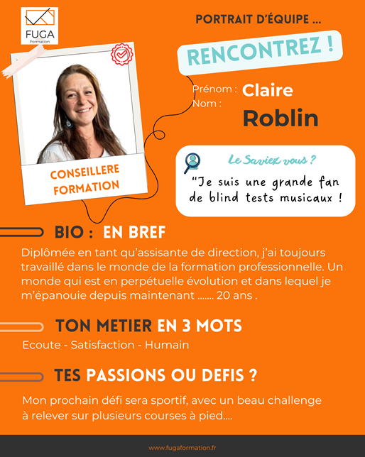 Chez FUGA FORMATION, chaque membre de l’équipe a son histoire… et aujourd’hui, on vous présente Claire ROBLIN, notre conseillère en formation professionnelle 🧡